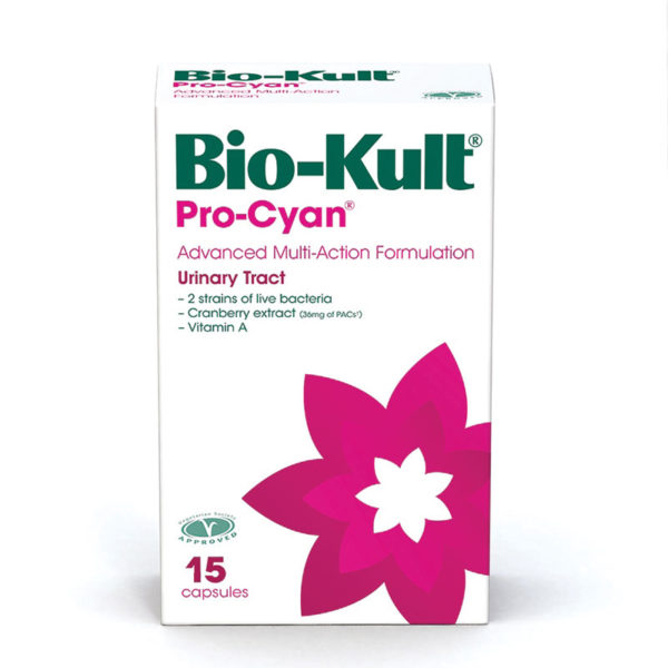 Το Bio-Kult® Pro-Cyan® είναι συμπλήρωμα διατροφής με φόρμουλα τριπλής δράσης, επιστημονικά τεκμηριωμένη, με εκχύλισμα Cranberry [36mg (A-type PACs)*] το οποίο δρα παρεμποδίζοντας την ικανότητα του E.coli να προσκολλάται στα τοιχώματα των βλεννογόνων, δύο προβιοτικές αλυσίδες Protexin (1,2 δις ανά γρ) επιλεγμένες ειδικά για την αντιμικροβιακή δράση τους κατά του E.coli και Enterococcus Faecalis και βιταμίνη Α (320 IU) για την ενίσχυση και προστασία του επιθηλίου του βλεννογόνου της ουροφόρας οδού και τη διατήρηση της ισορροπίας των Lactobacillus, καθώς και την ενίσχυση του ανοσοποιητικού.
